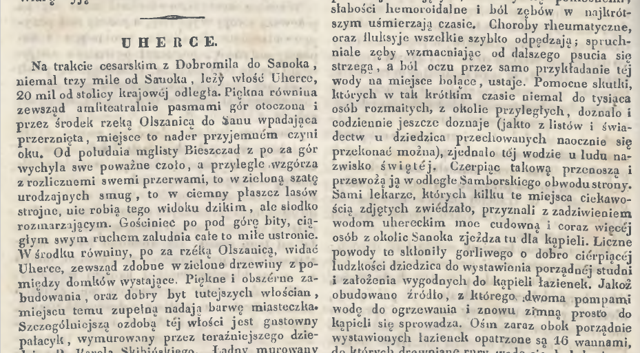 W 1837 roku w dodatku do „Gazety Lwowskiej” ukazał się artykuł reklamujący uherczański zakład zdrojowy, korzystający ze źródła wody siarczanowej. Podpisany jedynie inicjałem autor zachwycał się pięknem krajobrazu otaczającego miejscowość:
