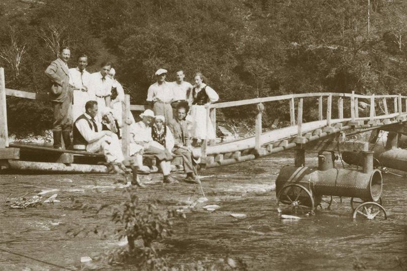 3. Czesław Wawrosz z letnikami na kładce w Rajskiem [Muzeum Bojków w Myczkowie]