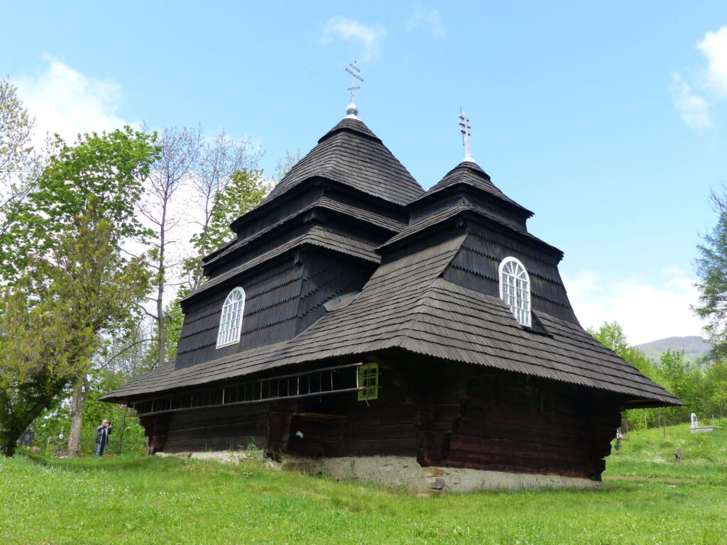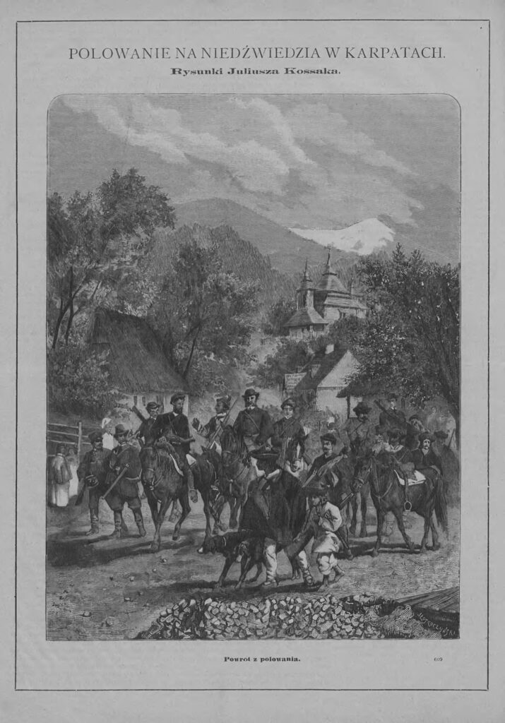 Końcem lata 1872 roku książę Adam Sapieha z Krasiczyna zorganizował w okolicach Sianek i Użoka łowy na niedźwiedzie. W polowaniu na zaproszenie księcia uczestniczyli m.in. książę Roman Sanguszko, hr. Adam Zamoyski M. Żółtowski z synem, panowie Leszczyński i Monasterski, a także Juliusz Kossak (1824–1899) z szesnastoletnim wówczas synem Wojciechem (1856–1942). Artysta wykonał dwa albumy ze szkicami akwarelowymi. Jeden z nich przetrwał do naszych czasu i jest przechowywany w Muzeum Czartoryskich w Krakowie. Album pt. „Przygody myśliwskie w Siankach i Użoku” zawiera dwanaście humorystycznych akwarel. Natomiast w 1874 roku malarz ukończył na zlecenie gospodarza łowów cykl czterech większych akwarel pt. „Polowanie na niedźwiedzia”. Do 1939 roku dzieła były przechowywane w Krasiczynie. W późniejszym okresie znajdowały się jako depozyt w Muzeum Narodowym w Krakowie, a w październiku 2018 roku zostały sprzedane do prywatnej kolekcji za 1 mln. 200 tys. zł. Prace te znane są m.in. z reprodukcji zamieszczonych w 1875 roku na łamach wydawanego w Warszawie „Tygodnika Ilustrowanego”. Na jednej z ze wspomnianych akwarel została uwieczniona cerkiew z Użoka.
