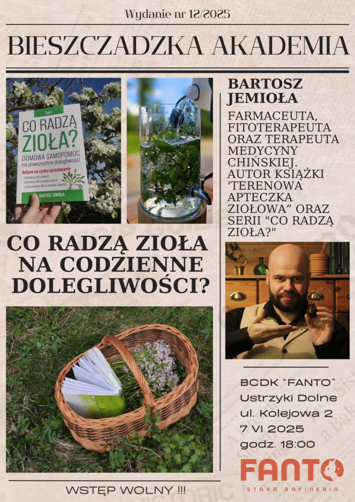 Przed nami kolejne spotkanie z cyklu „Bieszczadzka Akademia”. Tym razem naszym gościem będzie Bartosz Jemioła – farmaceuta, fitoterapeuta oraz terapeuta medycyny chińskiej, wykładowca farmakognozji. Prowadzi również wykłady teoretyczne oraz zajęcia terenowe z zakresu nowoczesnej fitoterapii, tradycyjnego ziołolecznictwa ludowego oraz dzikich roślin jadalnych. Autor książki „Terenowa apteczka ziołowa” oraz serii „Co radzą zioła?”